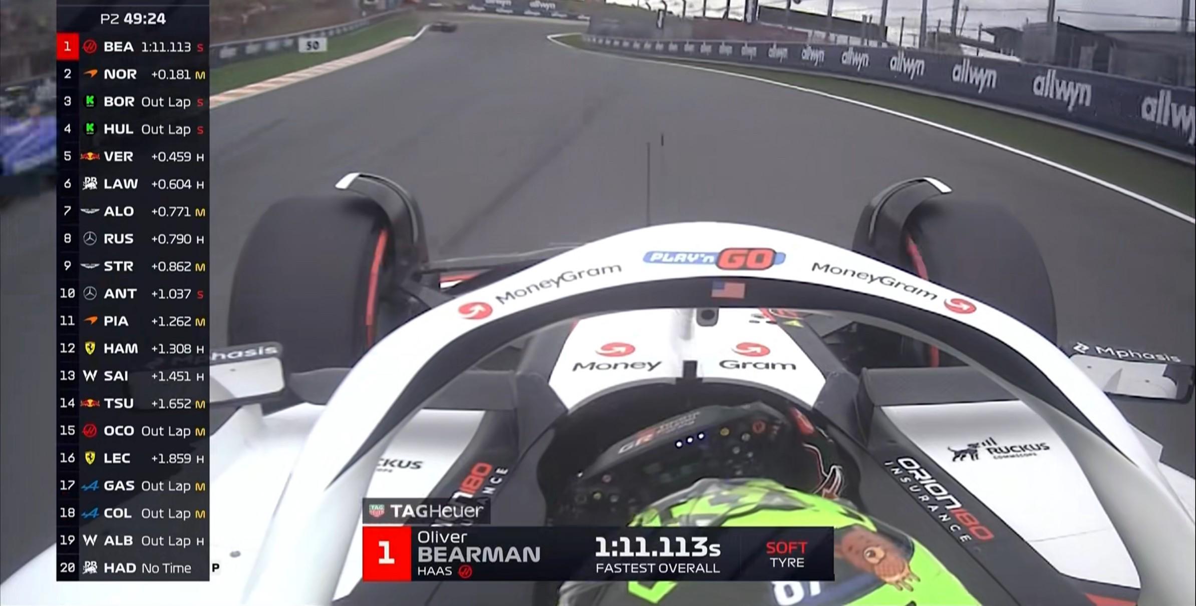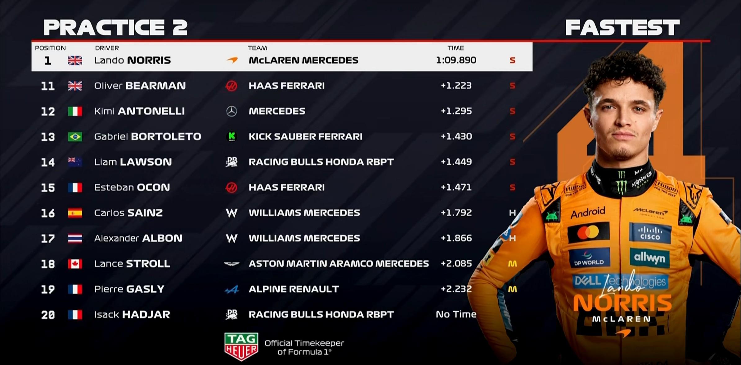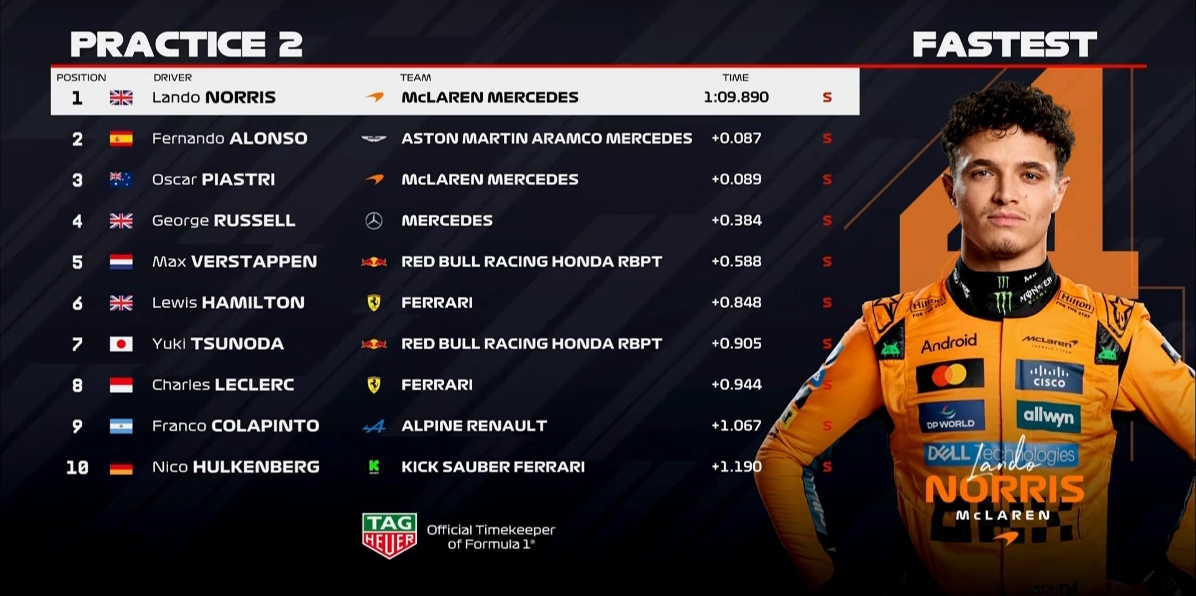 二练停表,诺里斯拿下全场最快,阿隆索排在第2;