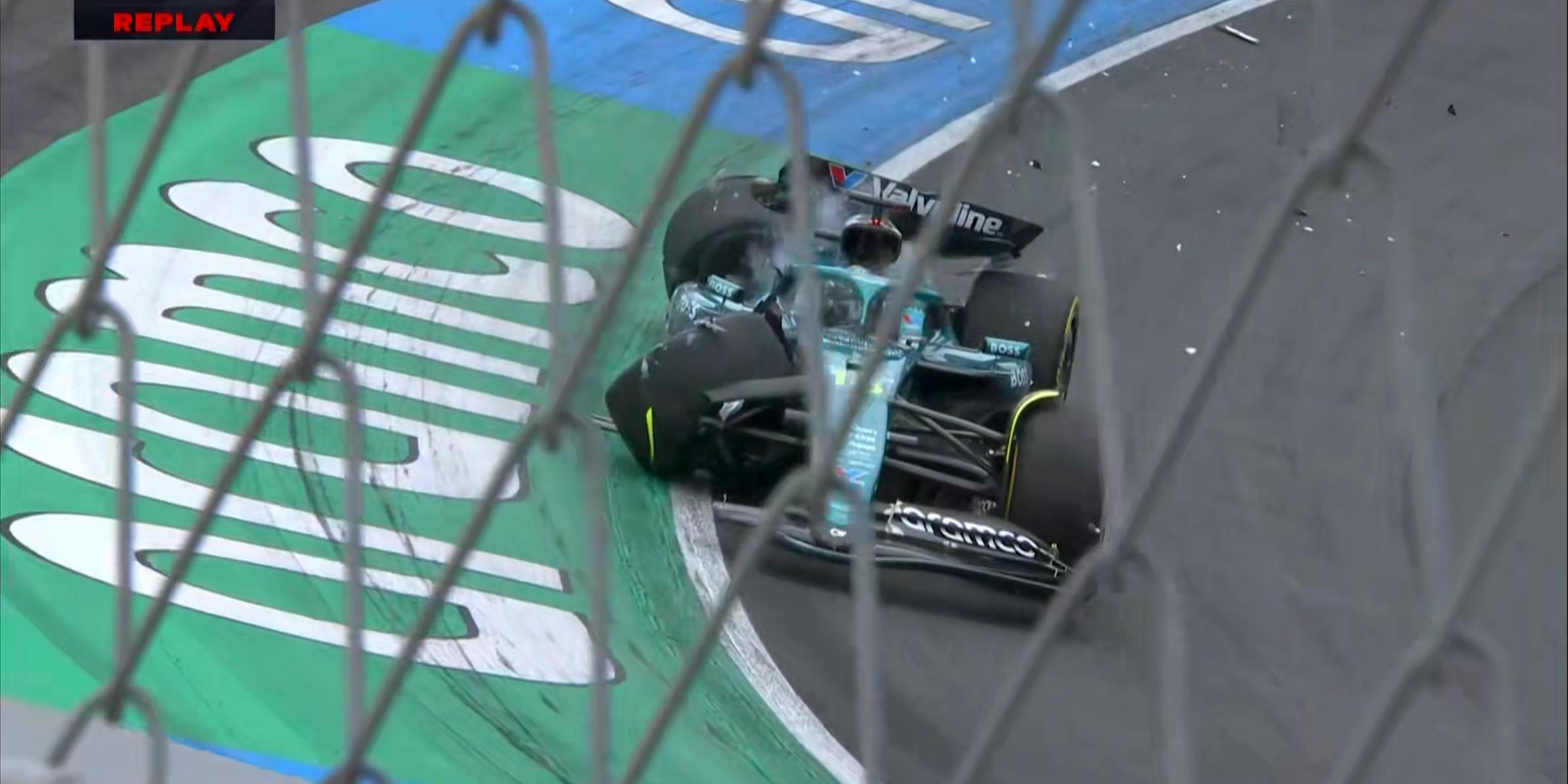 红旗!斯特罗尔的赛车在3号弯失控撞上TechPro护墙,赛车严重受损,同时存在漏液的状况!